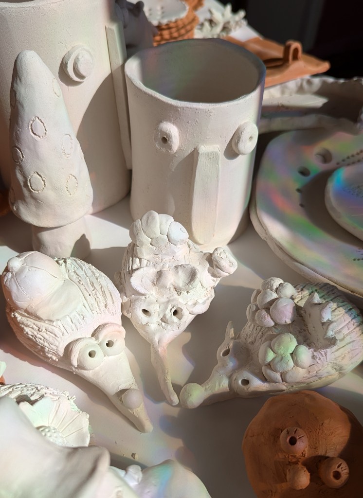 – Modelage de l’argile avec apprentissage des techniques de base par un petit exercice dirigé, puis création plus libre (+ 2 €/kg pour les pièces récupérées après cuisson biscuit, pesée des pièces après la cuisson).